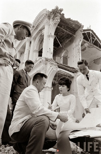 Bà Trần Lệ Xuân đang xem bản thiết kế dinh Độc Lập mớiDo không thể khôi phục lại, ông Ngô Đình Diệm đã cho san bằng và xây một dinh thự mới ngay trên nền đất cũ theo đồ án thiết kế của kiến trúc sư Ngô Viết Thụ, người Việt Nam đầu tiên đạt giải Khôi nguyên La Mã.Dinh Độc Lập mới được khởi công xây dựng ngày 1 tháng 7 năm 1962. Trong thời gian xây dựng, gia đình Tổng thống Ngô Đình Diệm tạm thời chuyển sang sống tại Dinh Gia Long. Công trình đang xây dựng dở dang thì ông Ngô Đình Diệm bị phe đảo chính ám sát ngày 2 tháng 11 năm 1963.3. Vài nét về dinh Độc Lập thời đệ II Cộng Hòa:Ngày 31 tháng 10 năm 1966, người chủ tọa buổi lễ là ông Nguyễn Văn Thiệu lúc đó là Chủ tịch Ủy ban Lãnh đạo Quốc gia. Từ ngày này, Dinh Độc Lập mới xây trở thành nơi ở và làm việc của tổng thống Việt Nam Cộng Hòa. Tổng thống Việt Nam Cộng Hòa Nguyễn Văn Thiệu sống ở dinh này từ tháng 10 năm 1967 đến ngày 21 tháng 4 năm 1975.