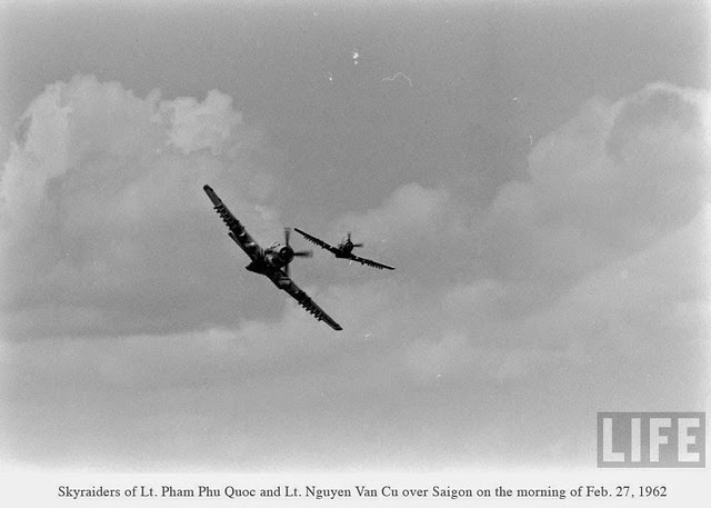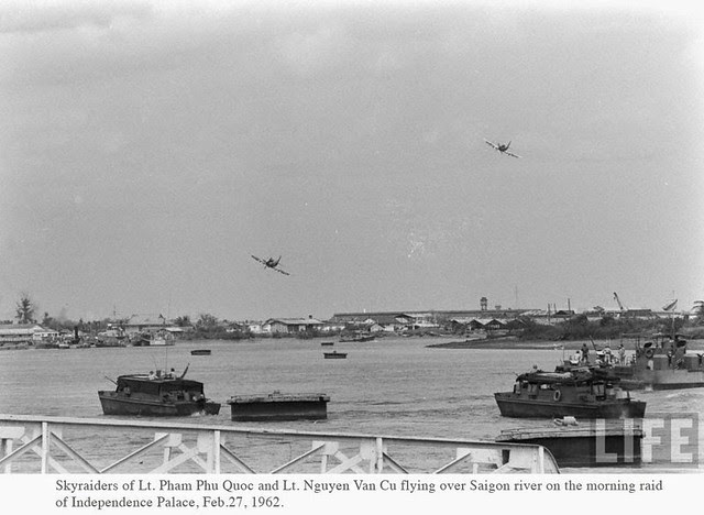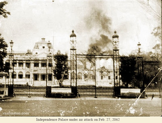 Vào lúc 7 giờ sáng, bầu trời Sài Gòn bị khuấy động bởi tiếng bom và tiếng súng máy nổ. Dinh Độc Lập chìm trong biển khói của cuộc tấn công từ hai chiếc máy bay ném bom A-1 Skyraider được Hoa Kỳ cung cấp.Hai chiếc máy bay này đã ném bom và napalm. Nhiều quả rocket và nhiều loạt đạn súng máy cũng được bắn vào tòa nhà. Ngày hôm đó nhiều mây, hai viên phi công này đã bay với độ cao khoảng 150 m, đã hoàn thành một vòng tấn công tứ phía trước khi bay lên mây. Họ đã tấn công trong 30 phút trước khi lực lượng phòng không trung thành với Ngô Đình Diệm có thể đến và phản công.
